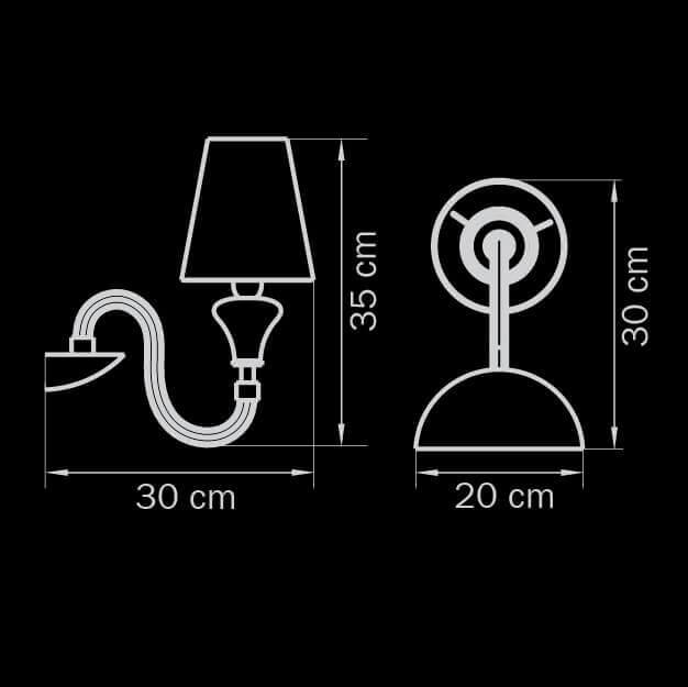 Для БРА необходима 1 лампа накаливания 40 W и цоколем E14. Габариты изделия: высота – 350 мм, диаметр – мм.