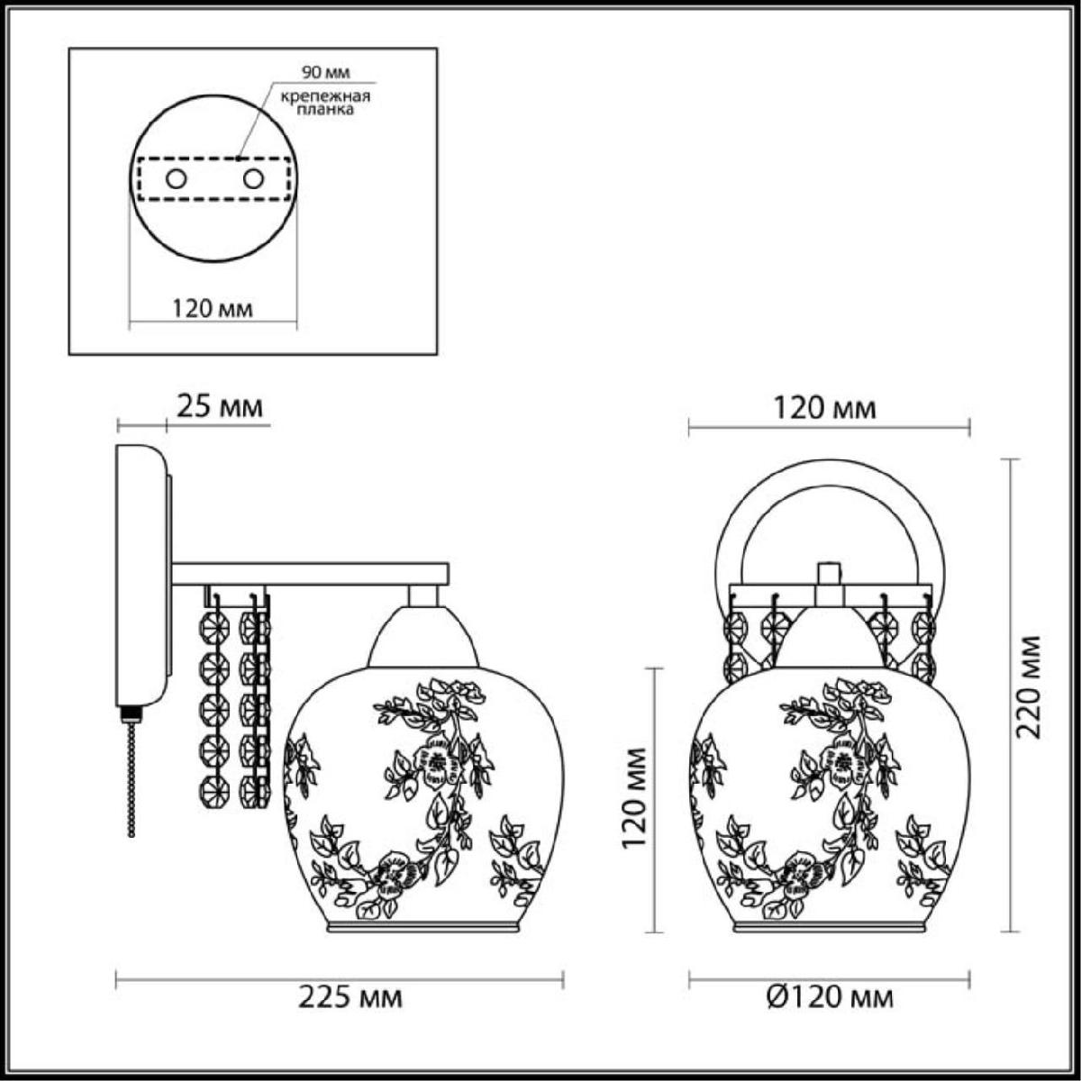 Для БРА необходима 1 лампа накаливания 60 W и цоколем E14. Габариты изделия: высота – 220 мм, диаметр – мм.
