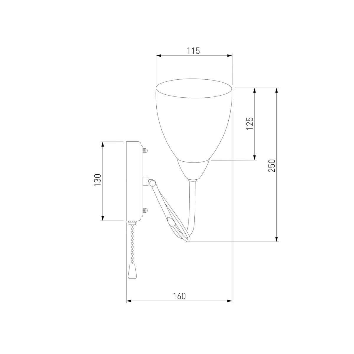 Для БРА необходима 1 лампа накаливания 40 W и цоколем E14. Габариты изделия: высота – 240 мм, диаметр – мм.