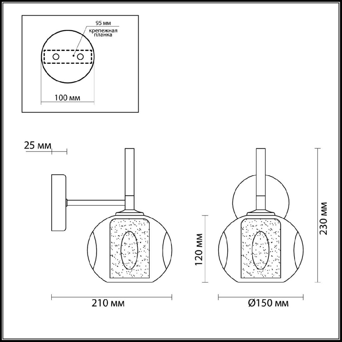 Для БРА необходима 1 лампа накаливания 40 W и цоколем E14. Габариты изделия: высота – 230 мм, диаметр – мм.