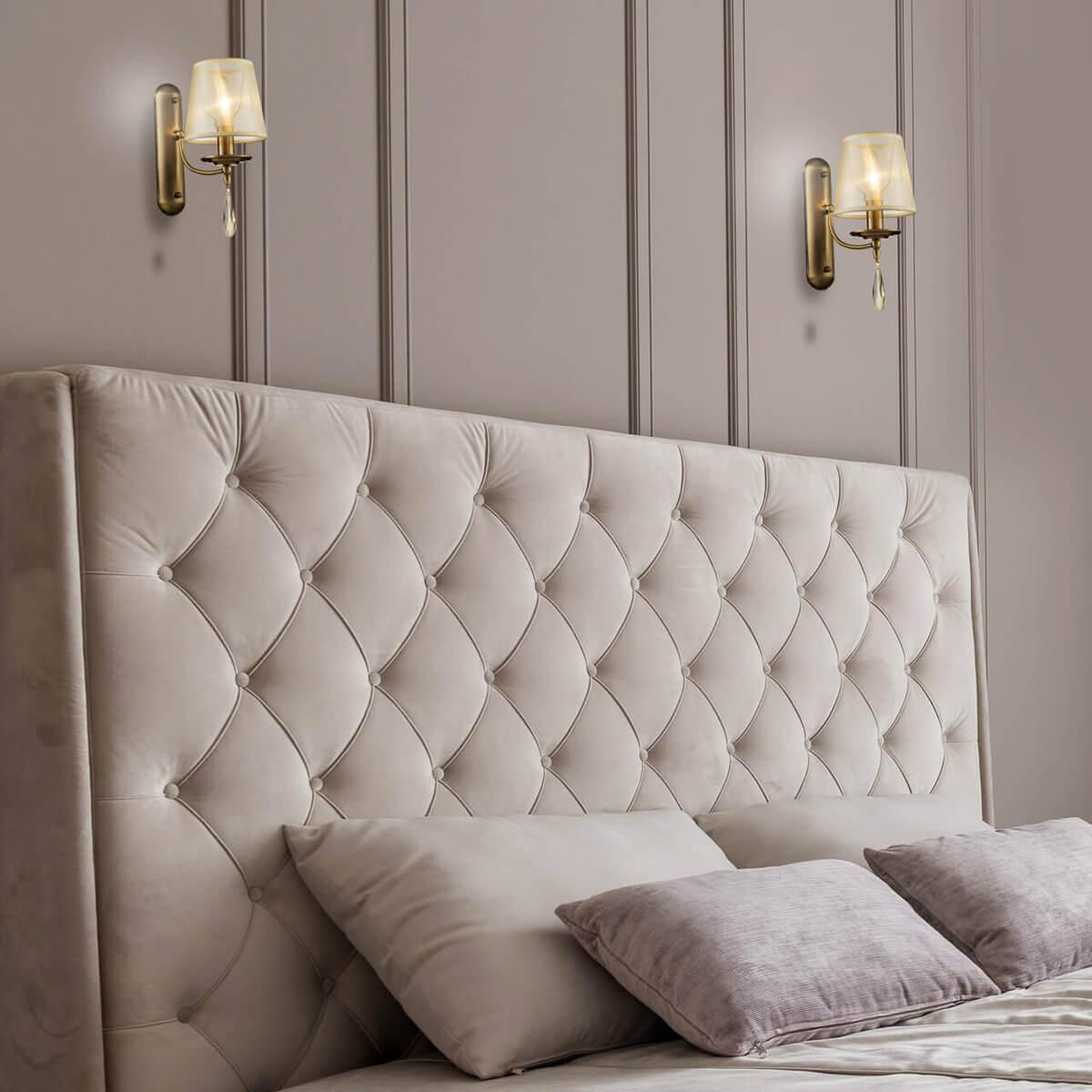 Бра F-Promo Imber 2639-1W от Немецкого бренда F-Promo из коллекции Imber предназначен для установки в спальни в стиле Арт-деко. Бра с металлической арматурой бронзового цвета и цвета шампунт плафонами из органзы, формы конуса предназначен для освещения 2,2 м2.