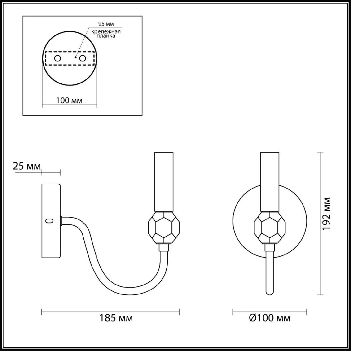 Для БРА необходима 1 лампа накаливания 60 W и цоколем E14. Габариты изделия: высота – 192 мм, диаметр – мм.