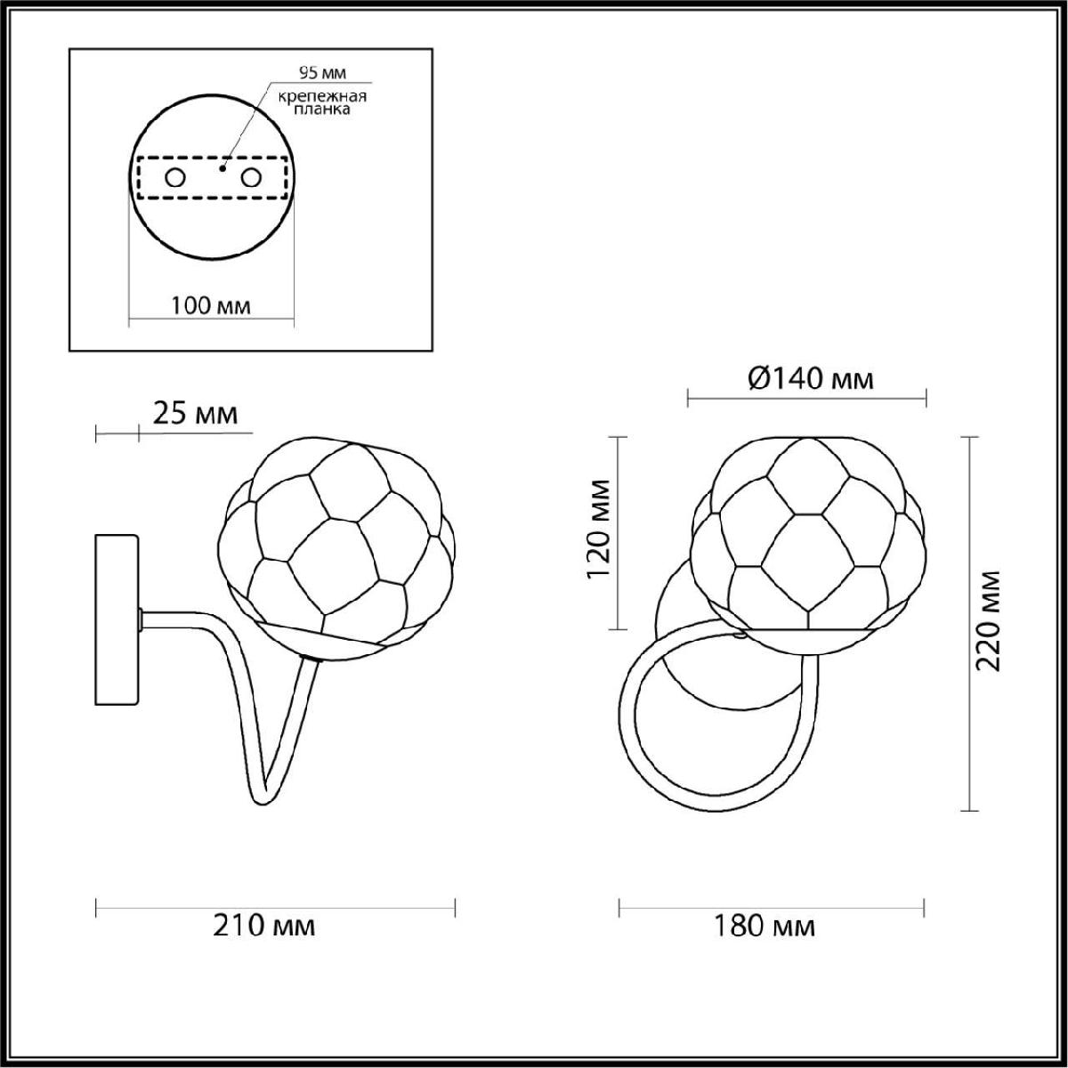 Для БРА необходима 1 лампа накаливания 40 W и цоколем E14. Габариты изделия: высота – 220 мм, диаметр – мм.