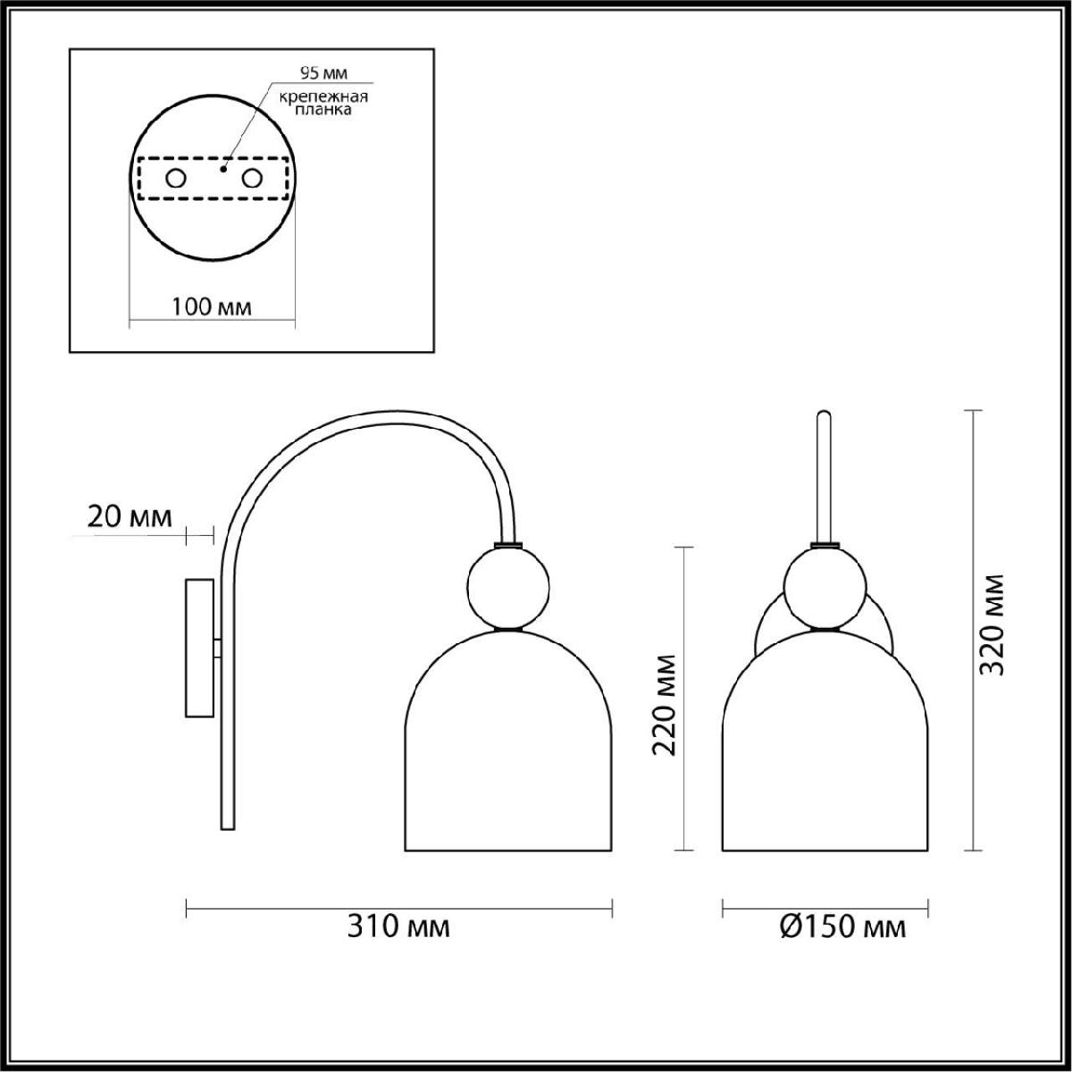 Для БРА необходима 1 лампа накаливания 60 W и цоколем E27. Габариты изделия: высота – 320 мм, диаметр – мм.