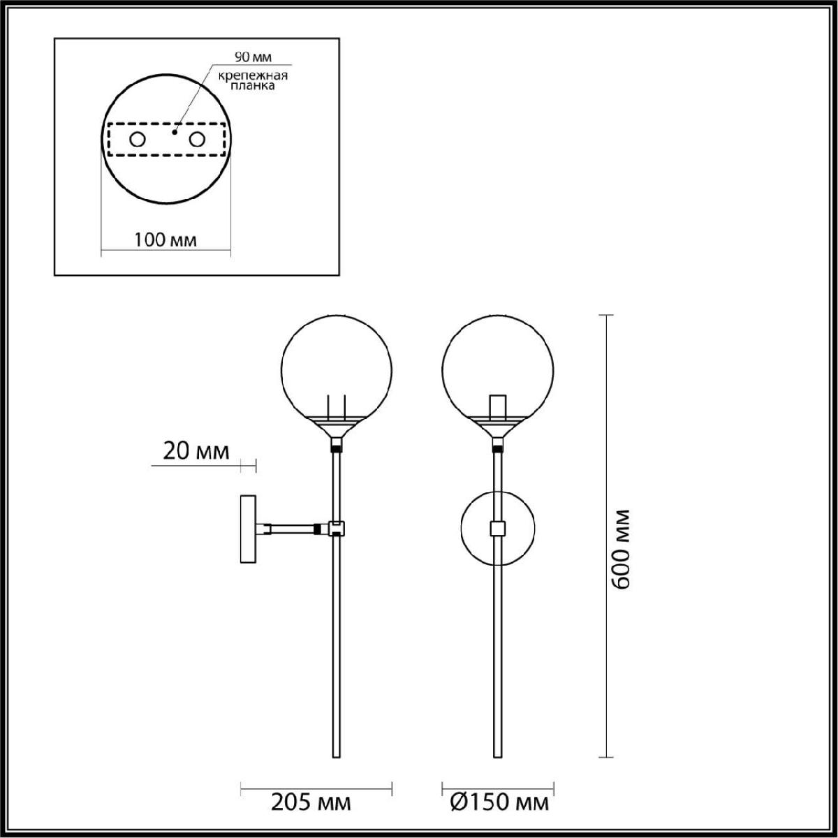 Для БРА необходима 1 галогеновая лампа 40 W и цоколем G9. Габариты изделия: высота – 600 мм, диаметр – мм.
