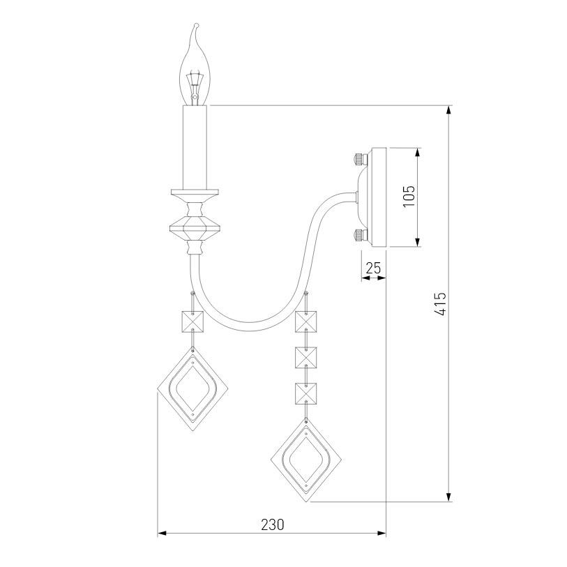 Для БРА необходима 1 лампа накаливания 60 W и цоколем E14. Габариты изделия: высота – 415 мм, диаметр – мм.