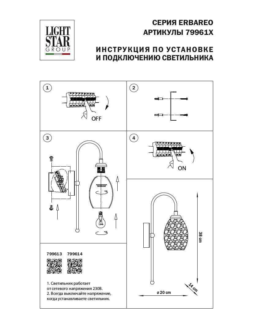 Для БРА необходима 1 лампа накаливания 40 W и цоколем E27. Габариты изделия: высота – 380 мм, диаметр – мм.