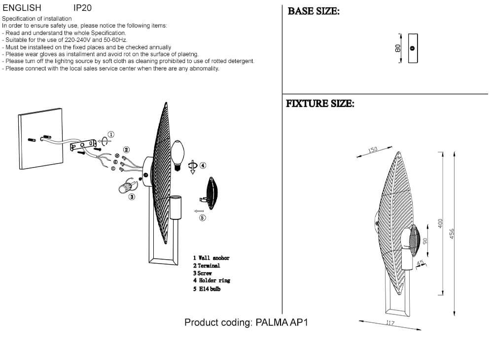 Для БРА необходима 1 лампа накаливания 60 W и цоколем E14. Габариты изделия: высота – 456 мм, диаметр – мм.