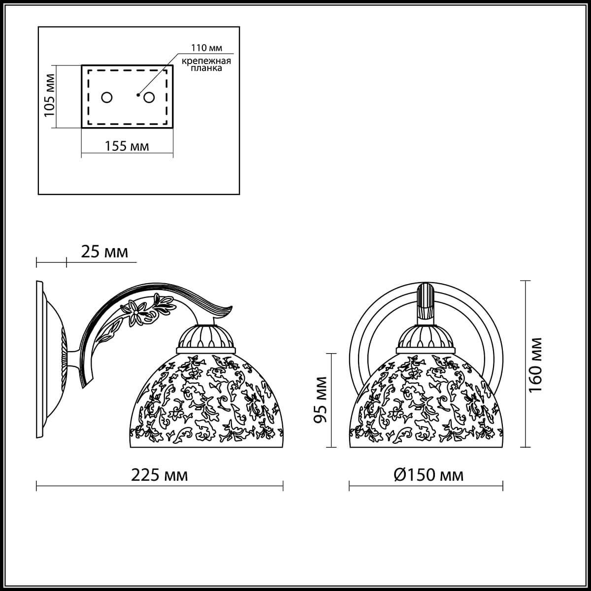 Для БРА необходима 1 лампа накаливания 60 W и цоколем E27. Габариты изделия: высота – 160 мм, диаметр – мм.