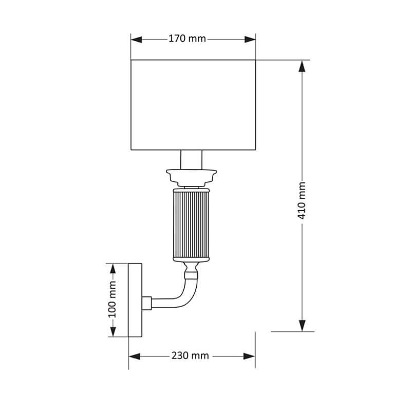 Для БРА необходима 1 лампа накаливания 40 W и цоколем E14. Габариты изделия: высота – 410 мм, диаметр – мм.