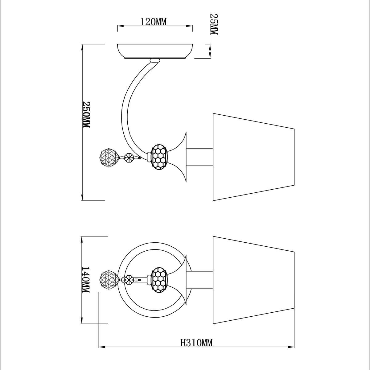 Для БРА необходима 1 лампа накаливания 40 W и цоколем E14. Габариты изделия: высота – 310 мм, диаметр – мм.