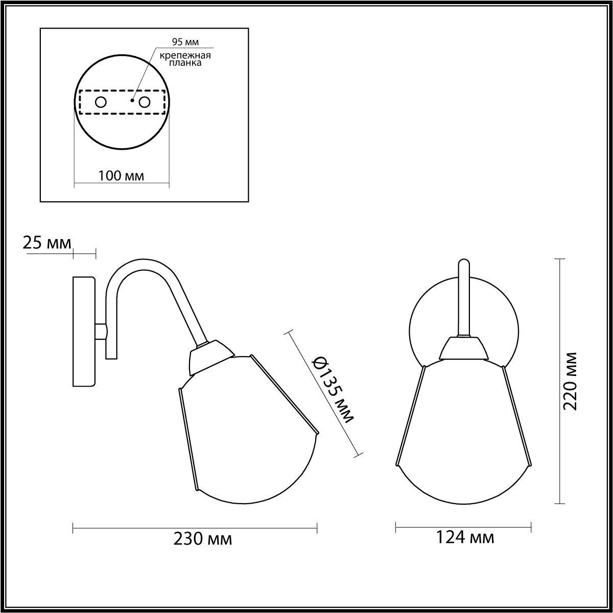 Для БРА необходима 1 лампа накаливания 40 W и цоколем E14. Габариты изделия: высота – 220 мм, диаметр – мм.