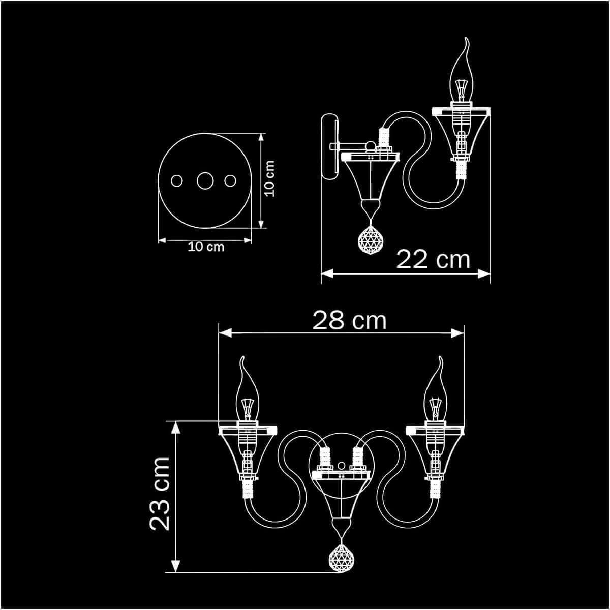 Для БРА необходима 2 лампы накаливания 60 W и цоколем E14. Габариты изделия: высота – 230 мм, диаметр – мм.