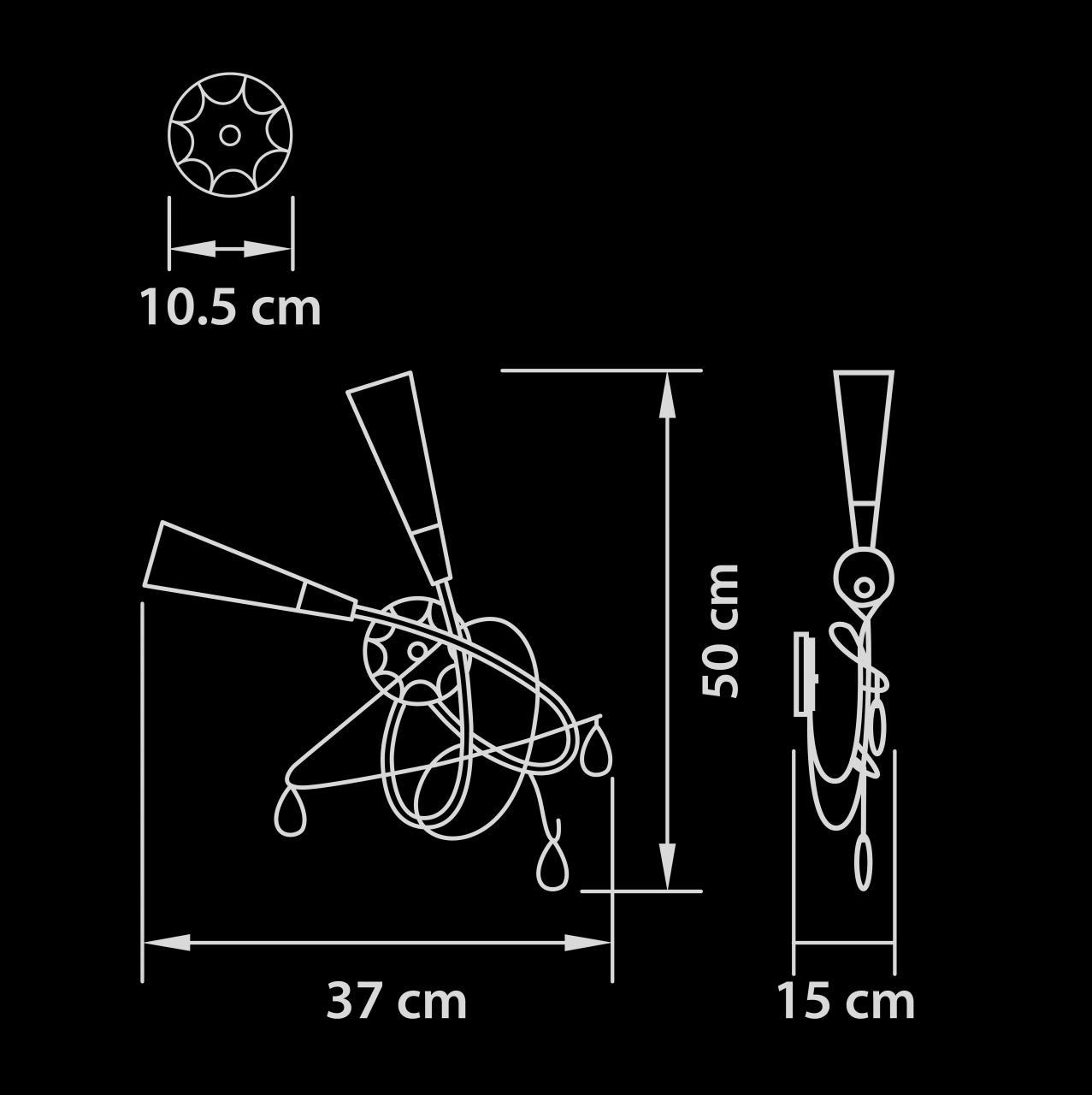 Для БРА необходима 2 галогеновые лампы 40 W и цоколем G9. Габариты изделия: высота – 500 мм, диаметр – 500 мм.