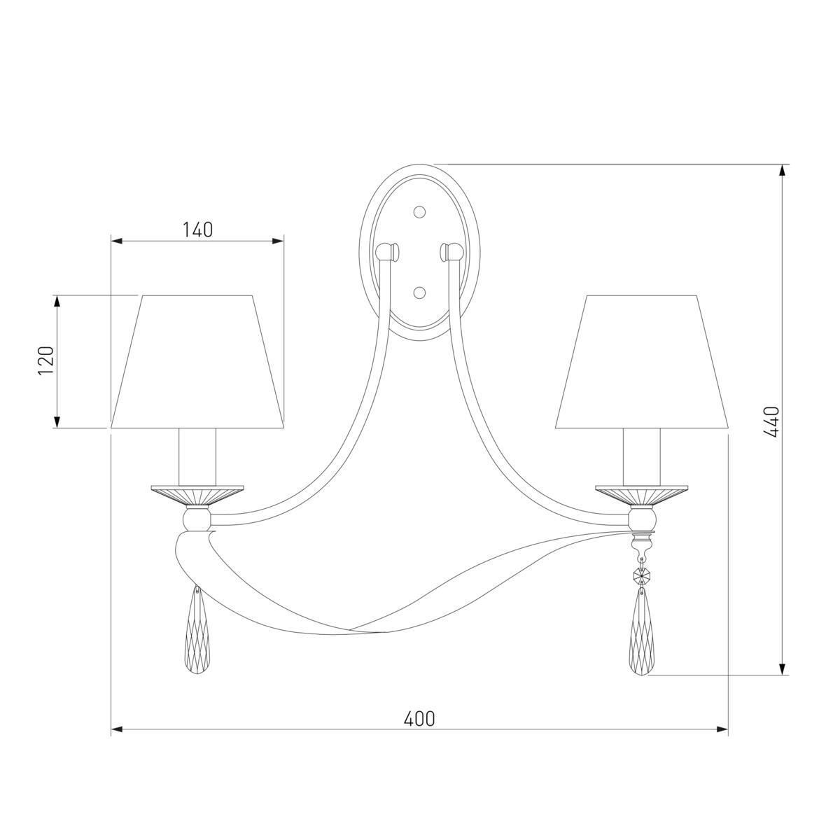 Для БРА необходима 2 лампы накаливания 40 W и цоколем E14. Габариты изделия: высота – 420 мм, диаметр – мм.