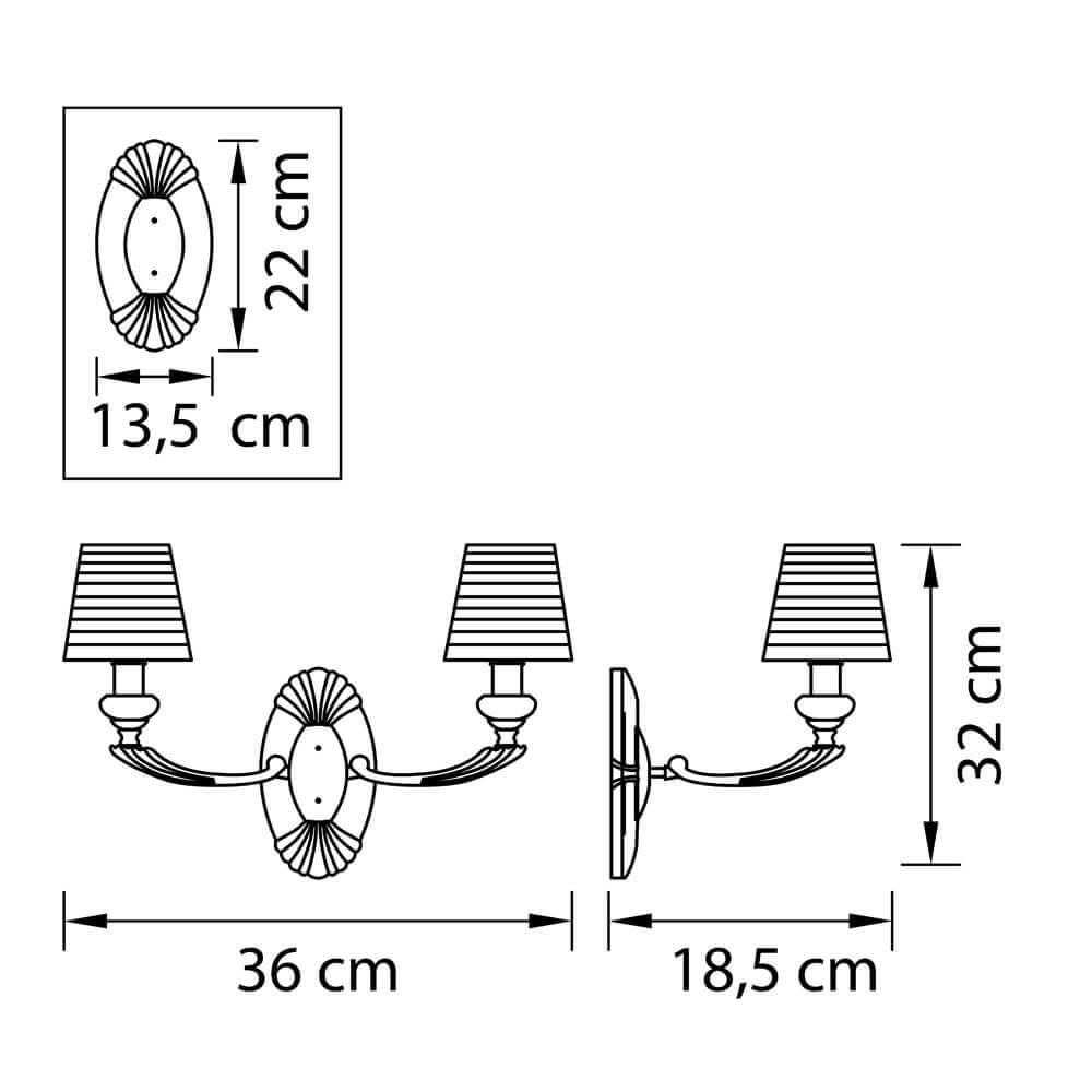 Для БРА необходима 2 лампы накаливания 40 W и цоколем E14. Габариты изделия: высота – 320 мм, диаметр – 0 мм.