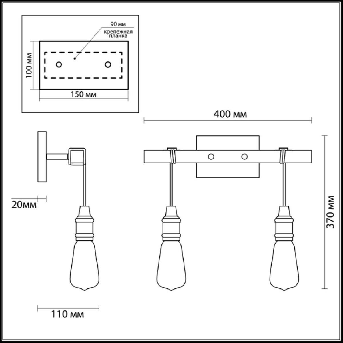 Для БРА необходима 2 лампы накаливания 60 W и цоколем E27. Габариты изделия: высота – 380 мм, диаметр – мм.