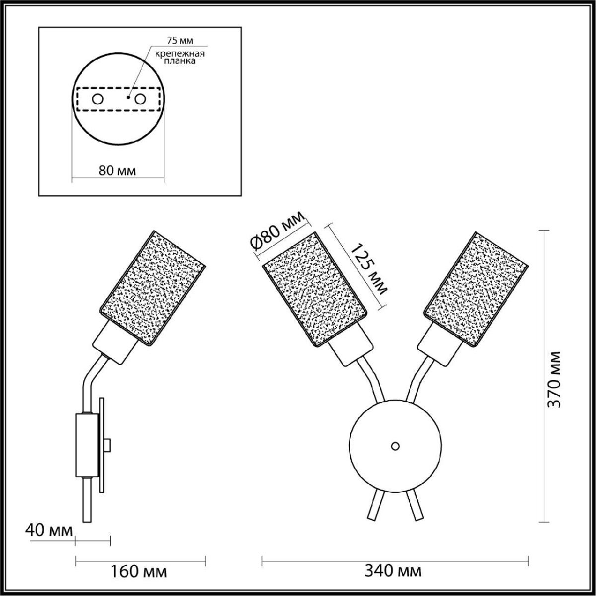 Для БРА необходима 2 лампы накаливания 60 W и цоколем E14. Габариты изделия: высота – 370 мм, диаметр – мм.
