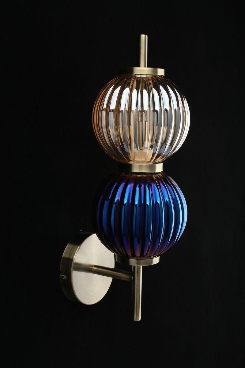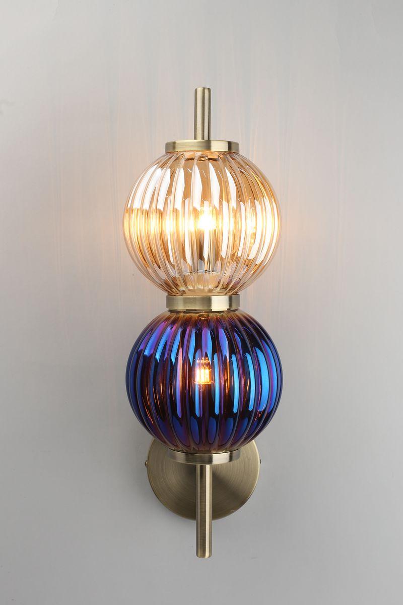 Бра Aployt Zhizel APL.608.11.02 от бренда из коллекции Zhizel предназначен для установки в гостиной в современном стиле. Бра с металлической арматурой бронзового цвета и синего цвета плафонами из стекла, формы предназначен для освещения м2.