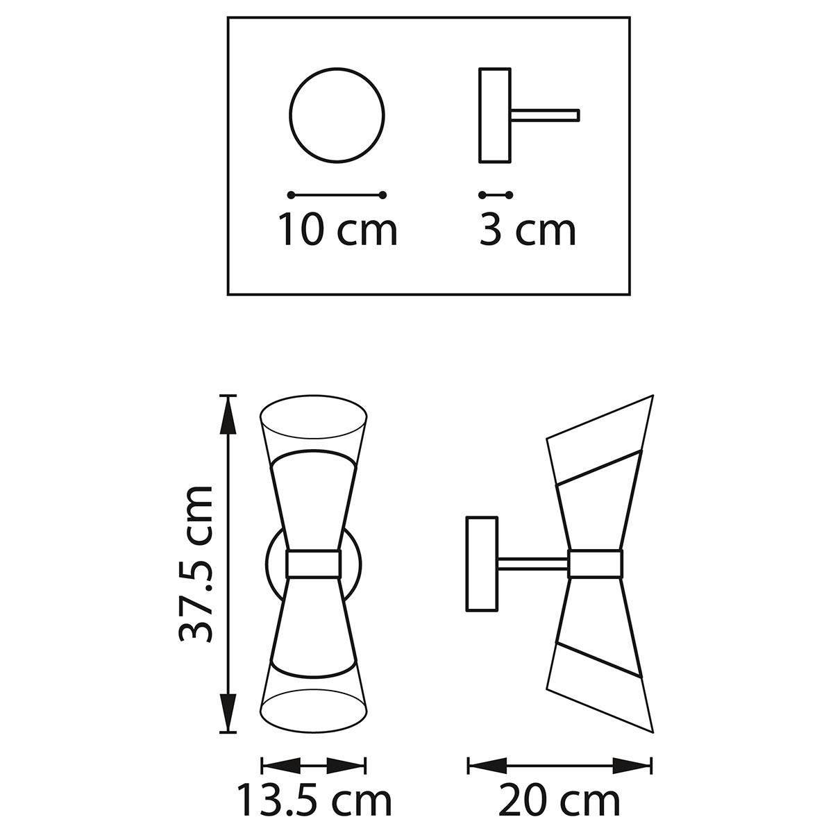 Для БРА необходима 2 лампы накаливания 40 W и цоколем E14. Габариты изделия: высота – 375 мм, диаметр – мм.