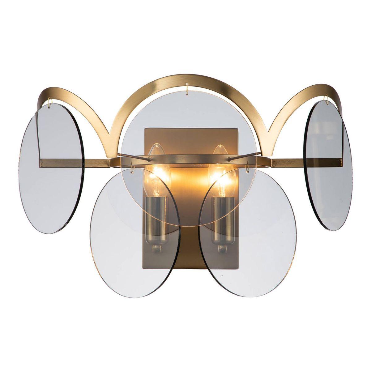 Бра Moderli Komo V7083-2W от Китайского бренда из коллекции Komo предназначен для установки в гостиной в стиле модерн. Бра с металлической арматурой цвета латуни и дымчатого цвета плафонами из стекла, формы предназначен для освещения м2.