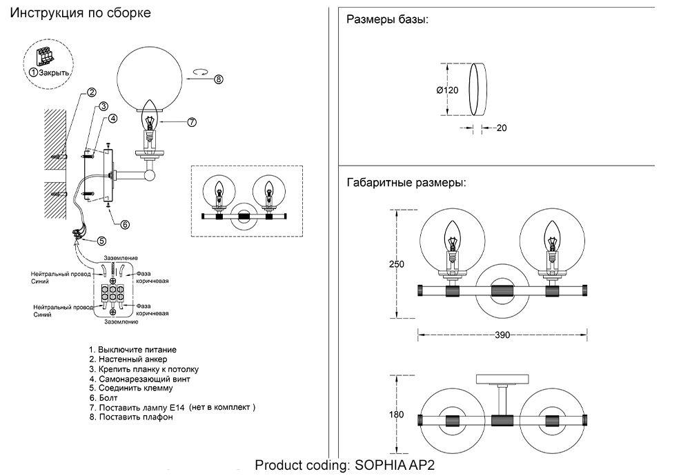 Для БРА необходима 2 лампы накаливания 40 W и цоколем E14. Габариты изделия: высота – 250 мм, диаметр – мм.