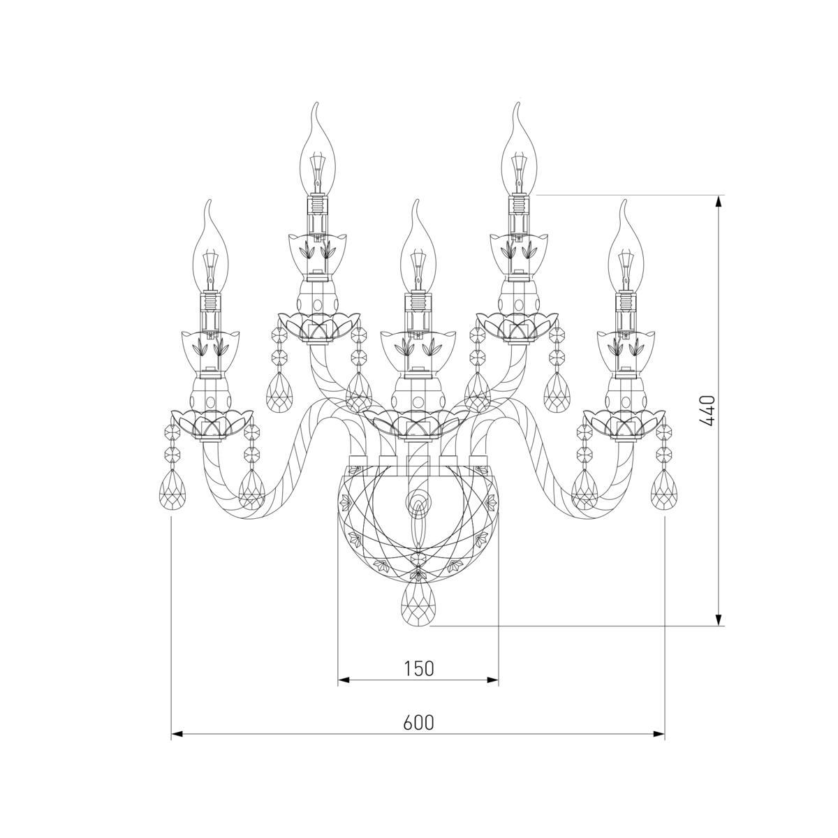 Для БРА необходима 5 ламп накаливания 60 W и цоколем E14. Габариты изделия: высота – 440 мм, диаметр – мм.