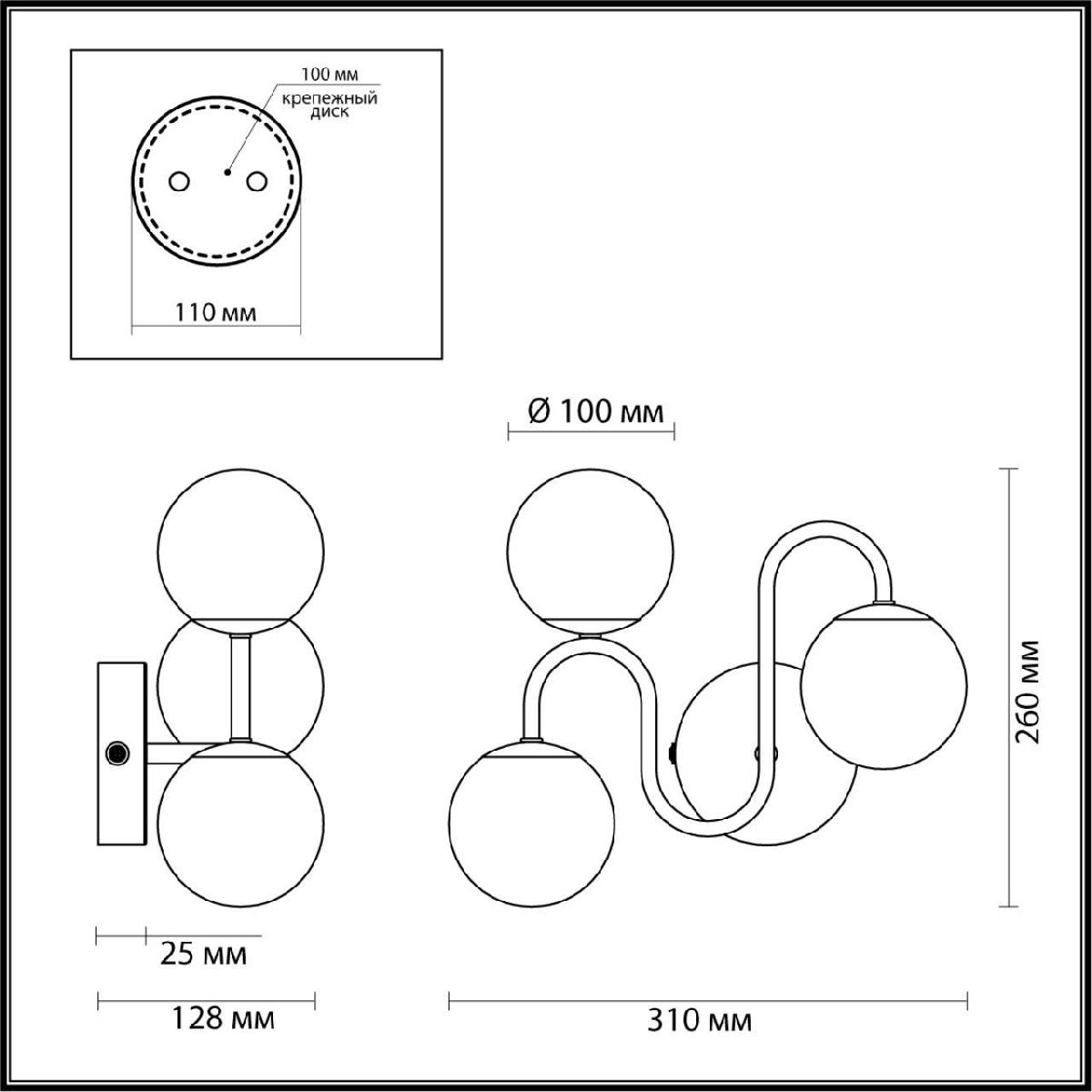 Для БРА необходима 3 галогеновые лампы 40 W и цоколем G9. Габариты изделия: высота – 260 мм, диаметр – мм.