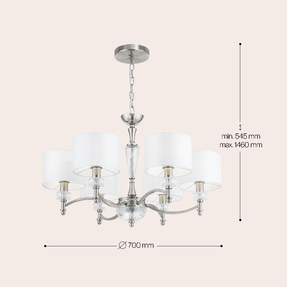 Производитель светильника рекомендует для устройства 6 с цоколем и мощностью W, что позволит осветить помещение площадью кв.м. Габариты изделия: высота – 1460 мм, диаметр – 700 мм.