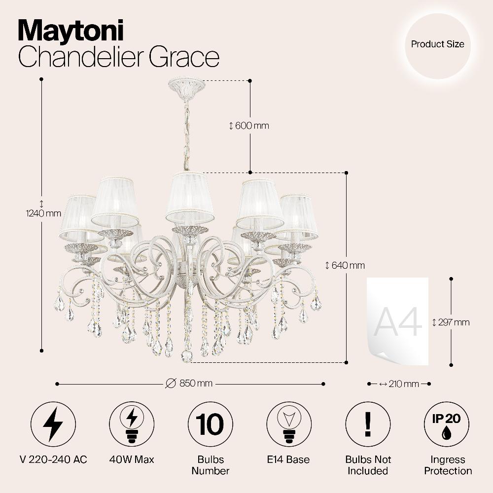 Люстра Maytoni ARM247-10-G от бренда из коллекции Elegant будет удачно смотреться в . Светильник выполнен из органзы с плафонами в форме белого цвета.