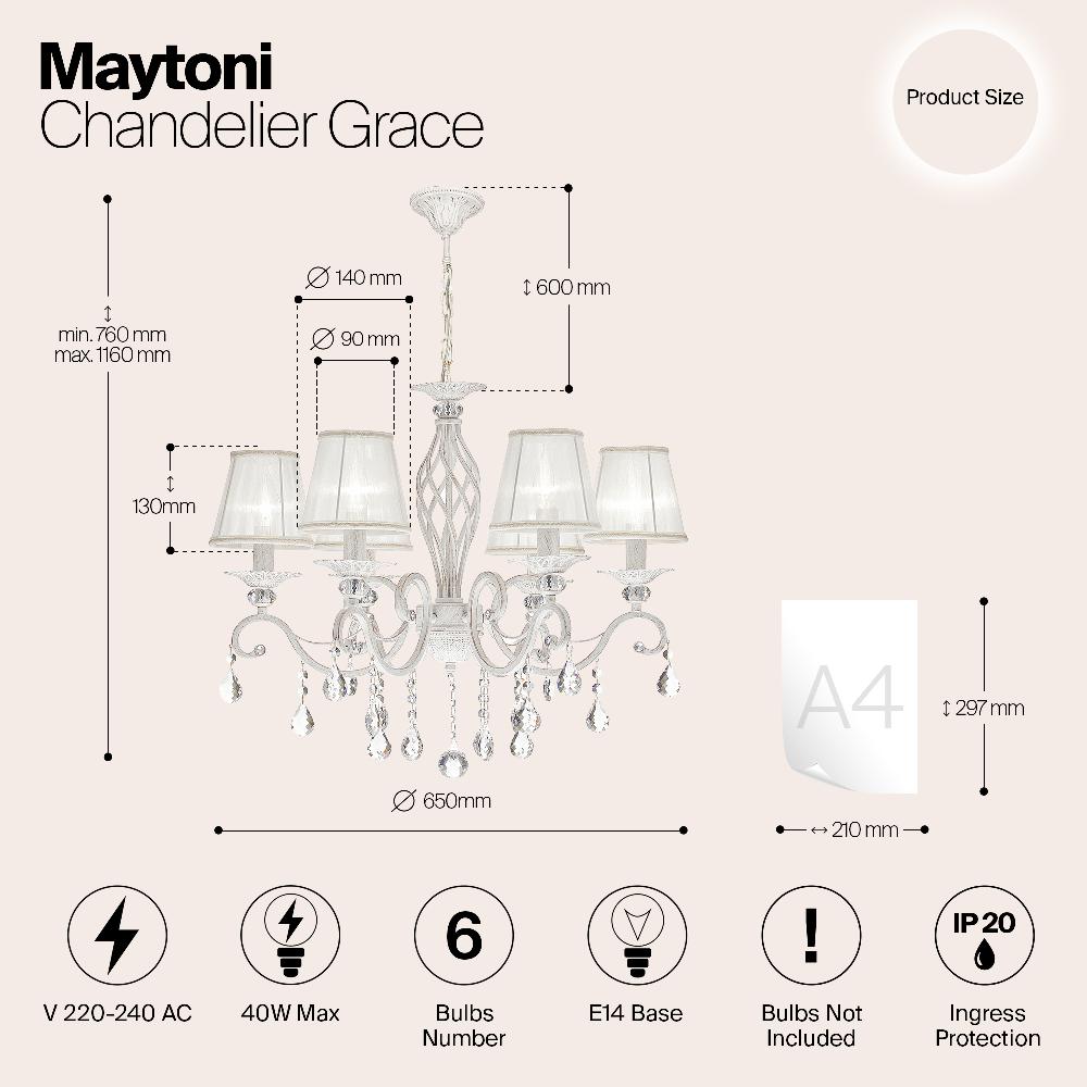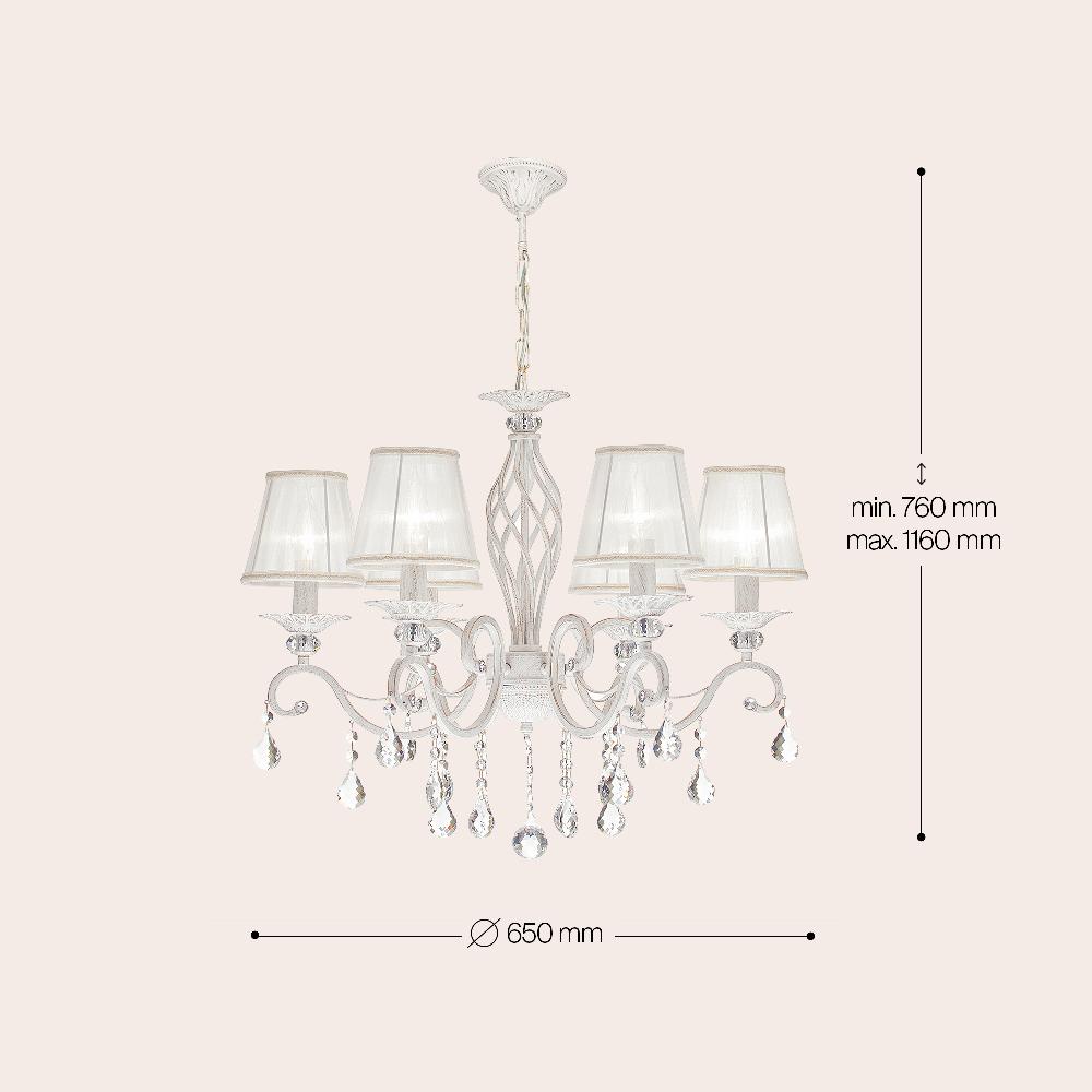 Производитель светильника рекомендует для устройства 6 с цоколем и мощностью W, что позволит осветить помещение площадью кв.м. Габариты изделия: высота – 1160 мм, диаметр – 630 мм.