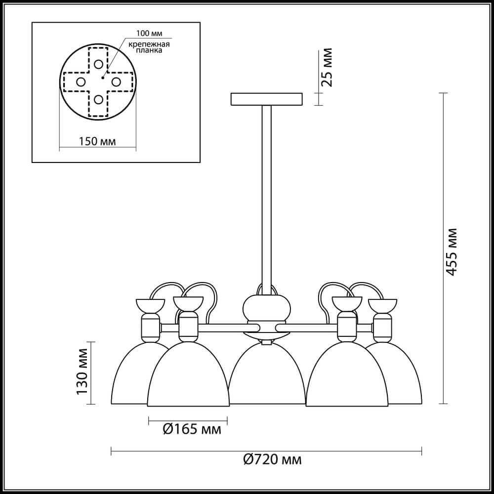 Производитель светильника рекомендует для устройства 5 ламп накаливания с цоколем E27 и мощностью 40 W, что позволит осветить помещение площадью кв.м. Габариты изделия: высота – 445 мм, диаметр – 720 мм.