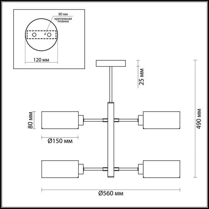 Производитель светильника рекомендует для устройства 4 лампы накаливания с цоколем E27 и мощностью 60 W, что позволит осветить помещение площадью кв.м. Габариты изделия: высота – 490 мм, диаметр – 560 мм.