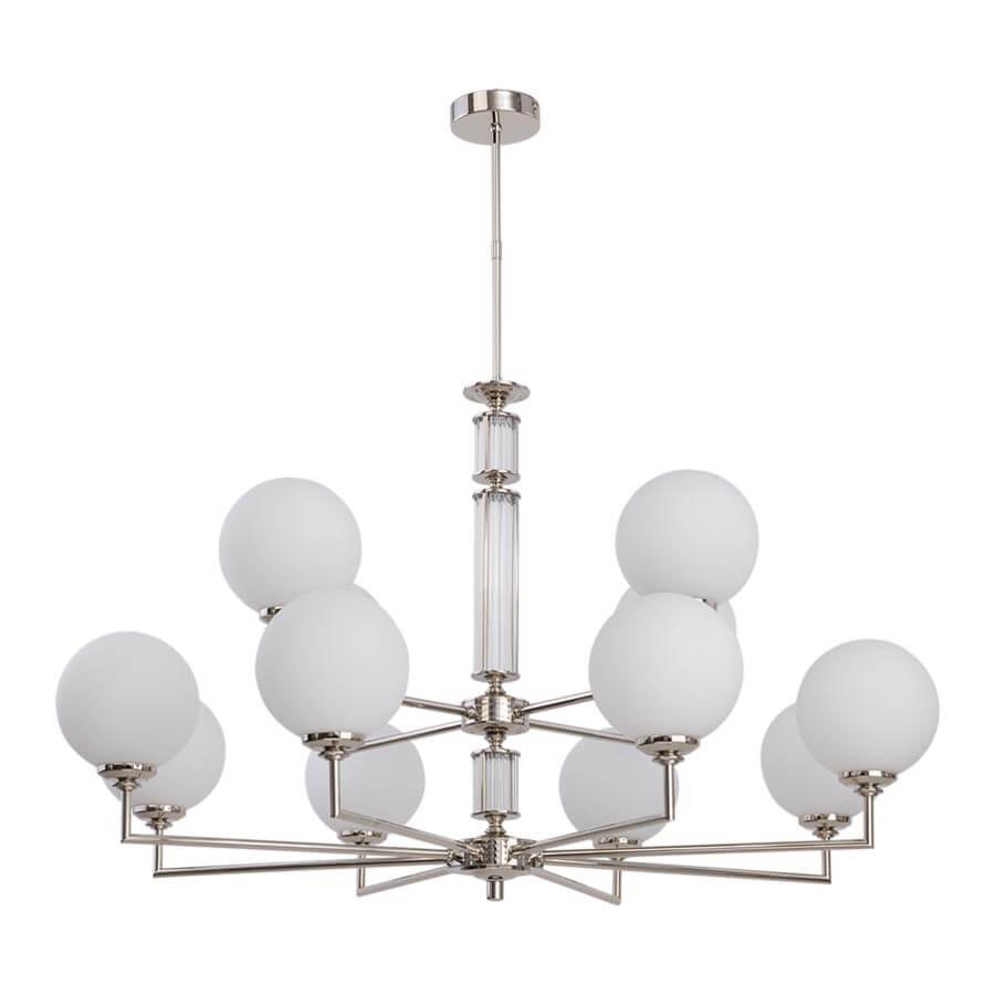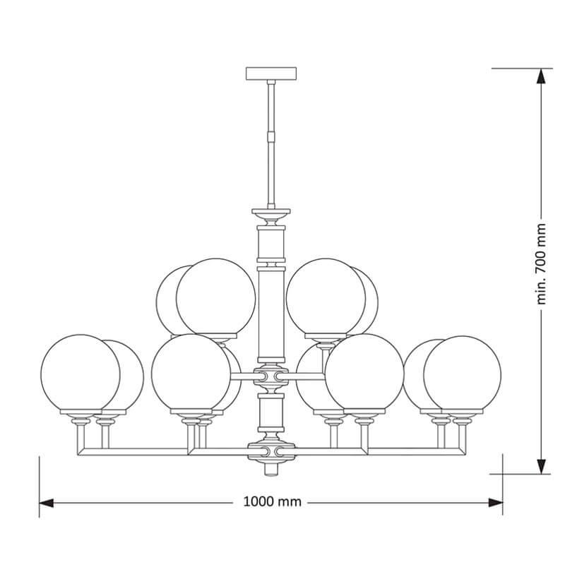 Производитель светильника рекомендует для устройства 12 ламп накаливания с цоколем E14 и мощностью 60 W, что позволит осветить помещение площадью кв.м. Габариты изделия: высота – 700 мм, диаметр – 1000 мм.
