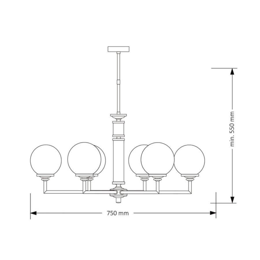 Производитель светильника рекомендует для устройства 6 ламп накаливания с цоколем E14 и мощностью 60 W, что позволит осветить помещение площадью кв.м. Габариты изделия: высота – 550 мм, диаметр – 750 мм.