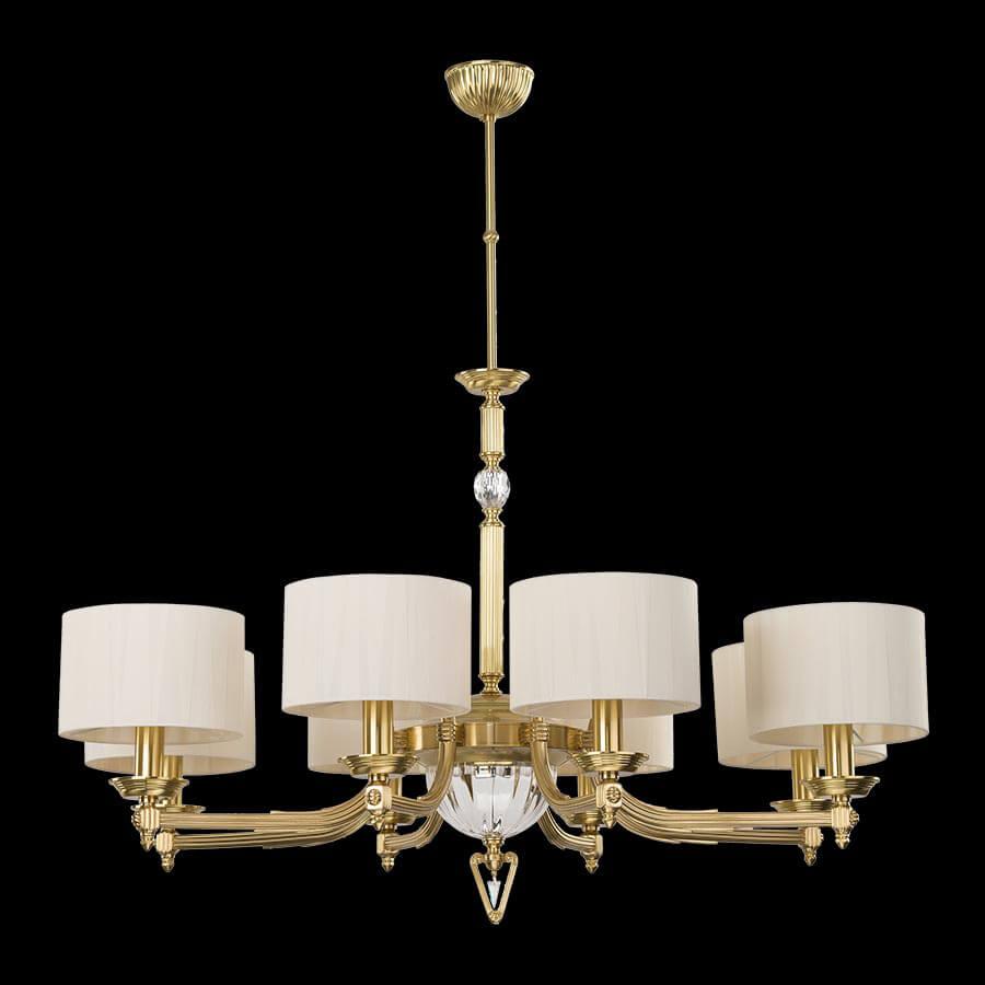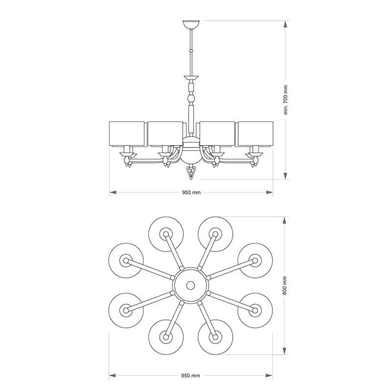 Производитель светильника рекомендует для устройства 8 ламп накаливания с цоколем E14 и мощностью 40 W, что позволит осветить помещение площадью кв.м. Габариты изделия: высота – 700 мм, диаметр – мм.