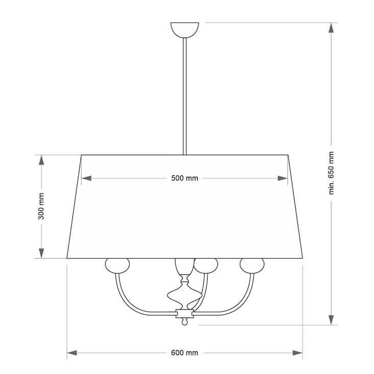 Производитель светильника рекомендует для устройства 3 лампы накаливания с цоколем E14 и мощностью 60 W, что позволит осветить помещение площадью кв.м. Габариты изделия: высота – 650 мм, диаметр – 600 мм.