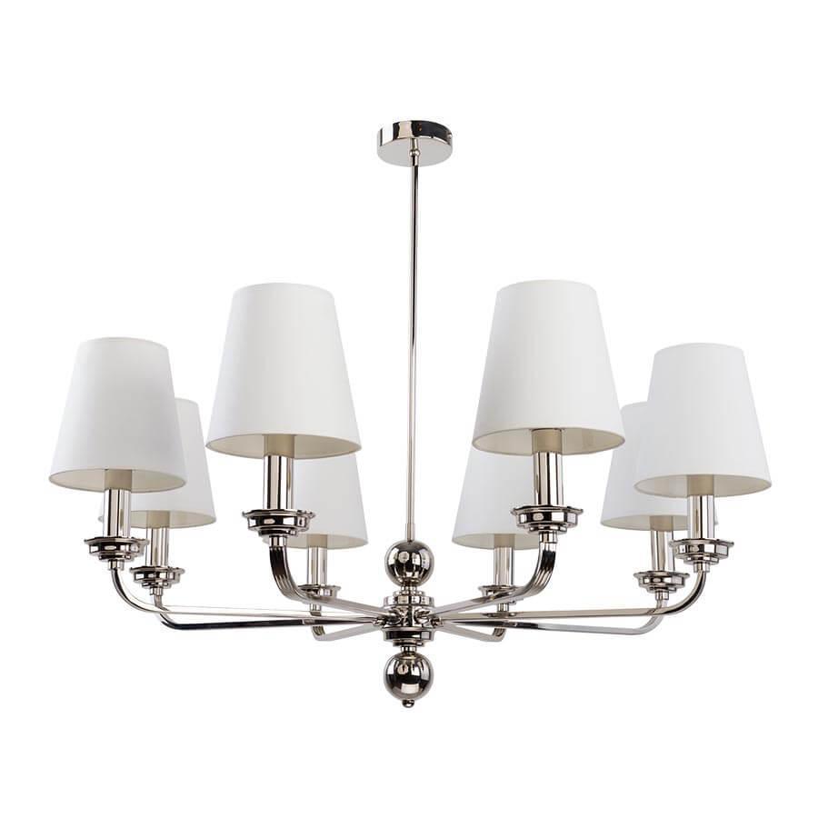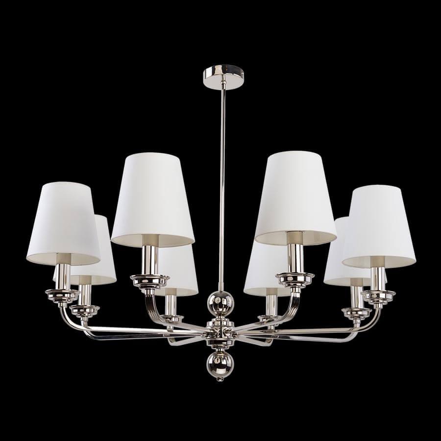 Производитель светильника рекомендует для устройства 8 ламп накаливания с цоколем E14 и мощностью 40 W, что позволит осветить помещение площадью кв.м. Габариты изделия: высота – 450 мм, диаметр – 850 мм.