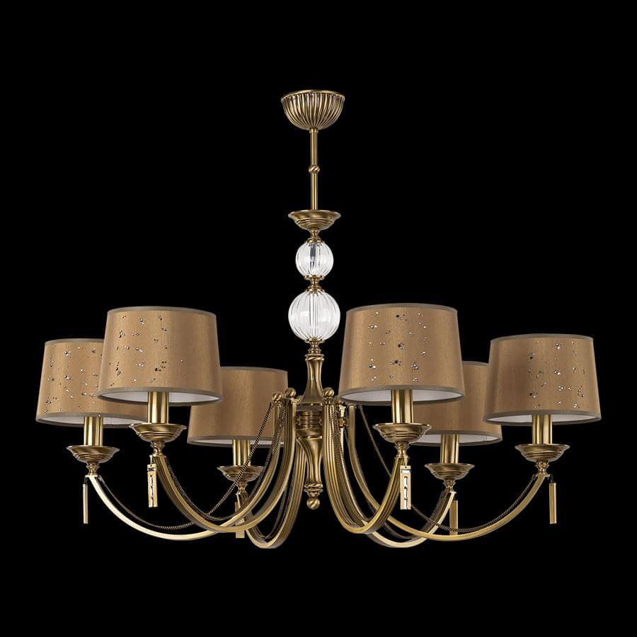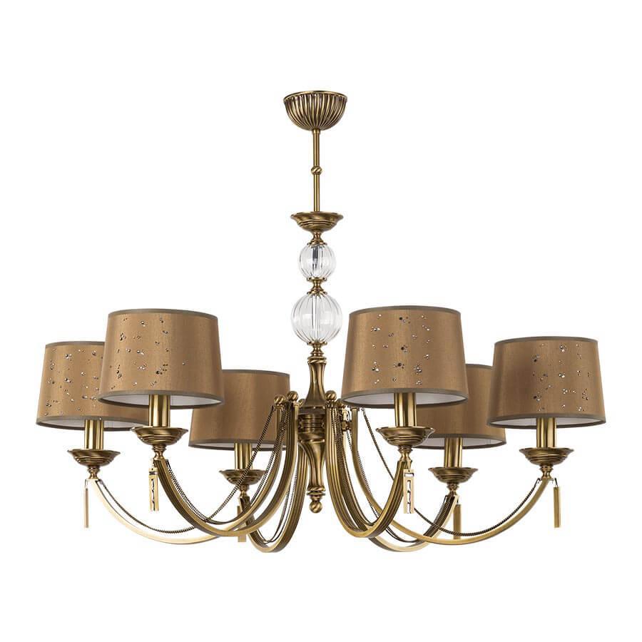 Производитель светильника рекомендует для устройства 6 ламп накаливания с цоколем E14 и мощностью 40 W, что позволит осветить помещение площадью кв.м. Габариты изделия: высота – 700 мм, диаметр – 850 мм.