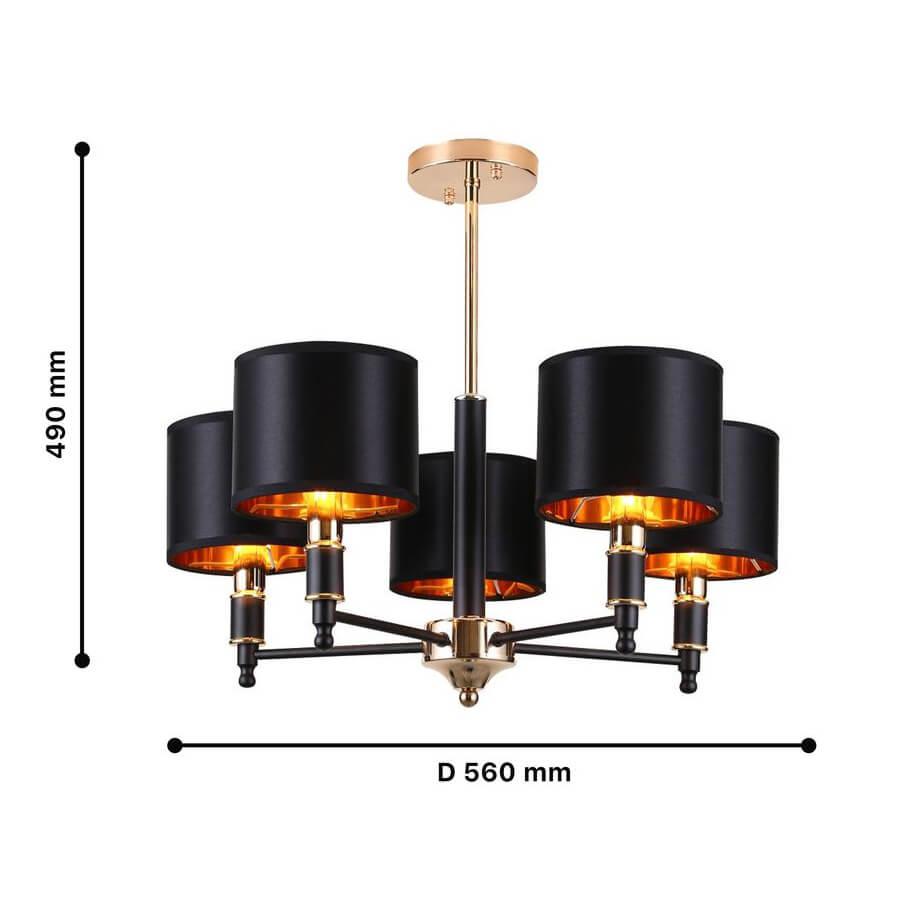 Производитель светильника рекомендует для устройства 5 ламп накаливания с цоколем E14 и мощностью 40 W, что позволит осветить помещение площадью кв.м. Габариты изделия: высота – 490 мм, диаметр – 560 мм.