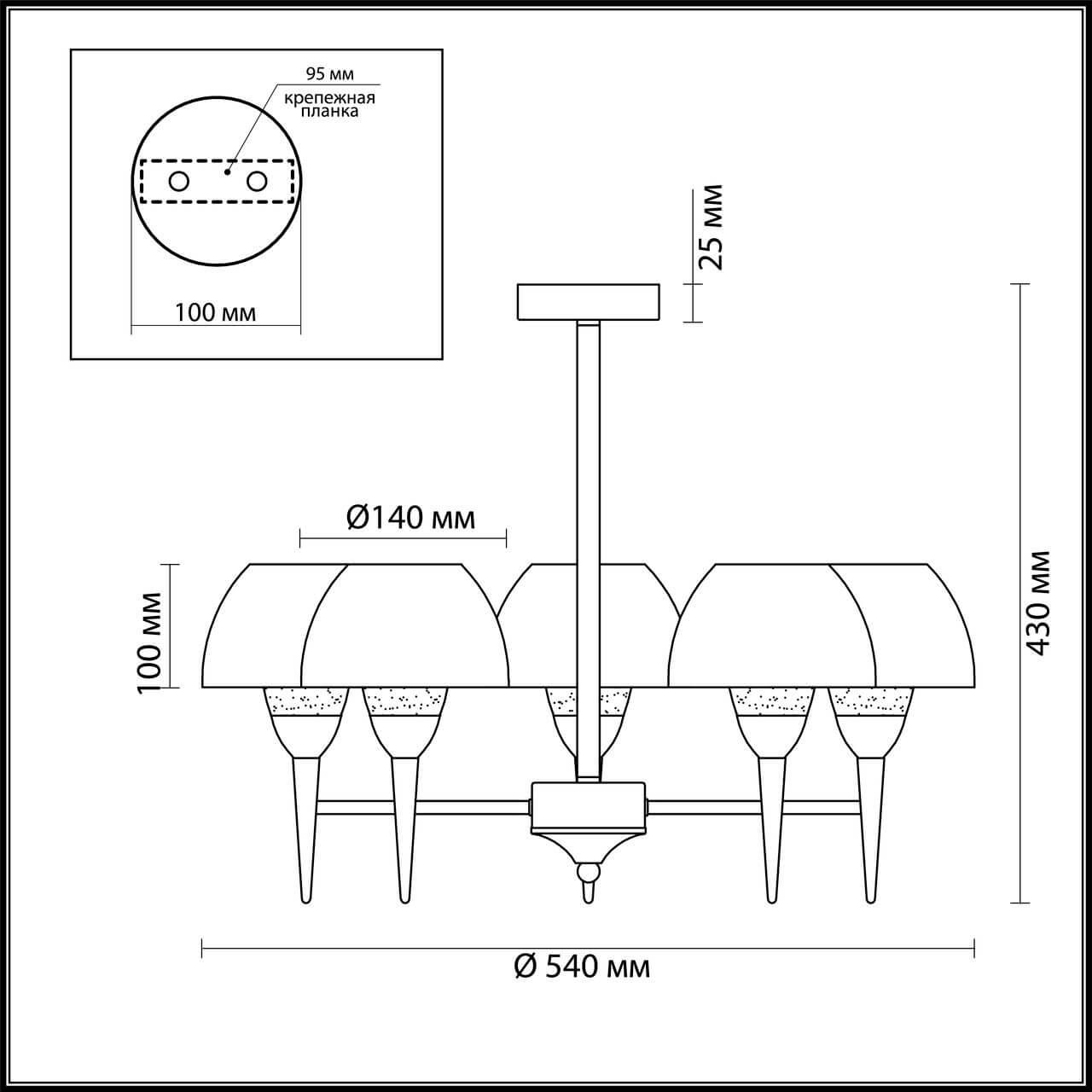 Производитель светильника рекомендует для устройства 5 ламп накаливания с цоколем E14 и мощностью 40 W, что позволит осветить помещение площадью кв.м. Габариты изделия: высота – 430 мм, диаметр – 540 мм.