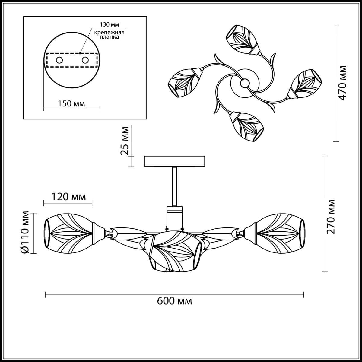 Производитель светильника рекомендует для устройства 4 лампы накаливания с цоколем E27 и мощностью 60 W, что позволит осветить помещение площадью кв.м. Габариты изделия: высота – 270 мм, диаметр – мм.