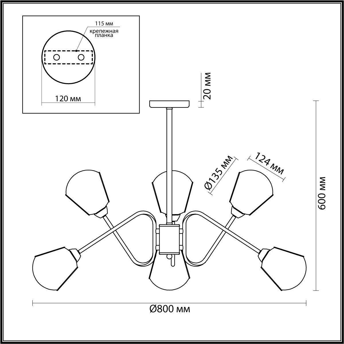 Производитель светильника рекомендует для устройства 6 ламп накаливания с цоколем E14 и мощностью 40 W, что позволит осветить помещение площадью кв.м. Габариты изделия: высота – 600 мм, диаметр – 800 мм.