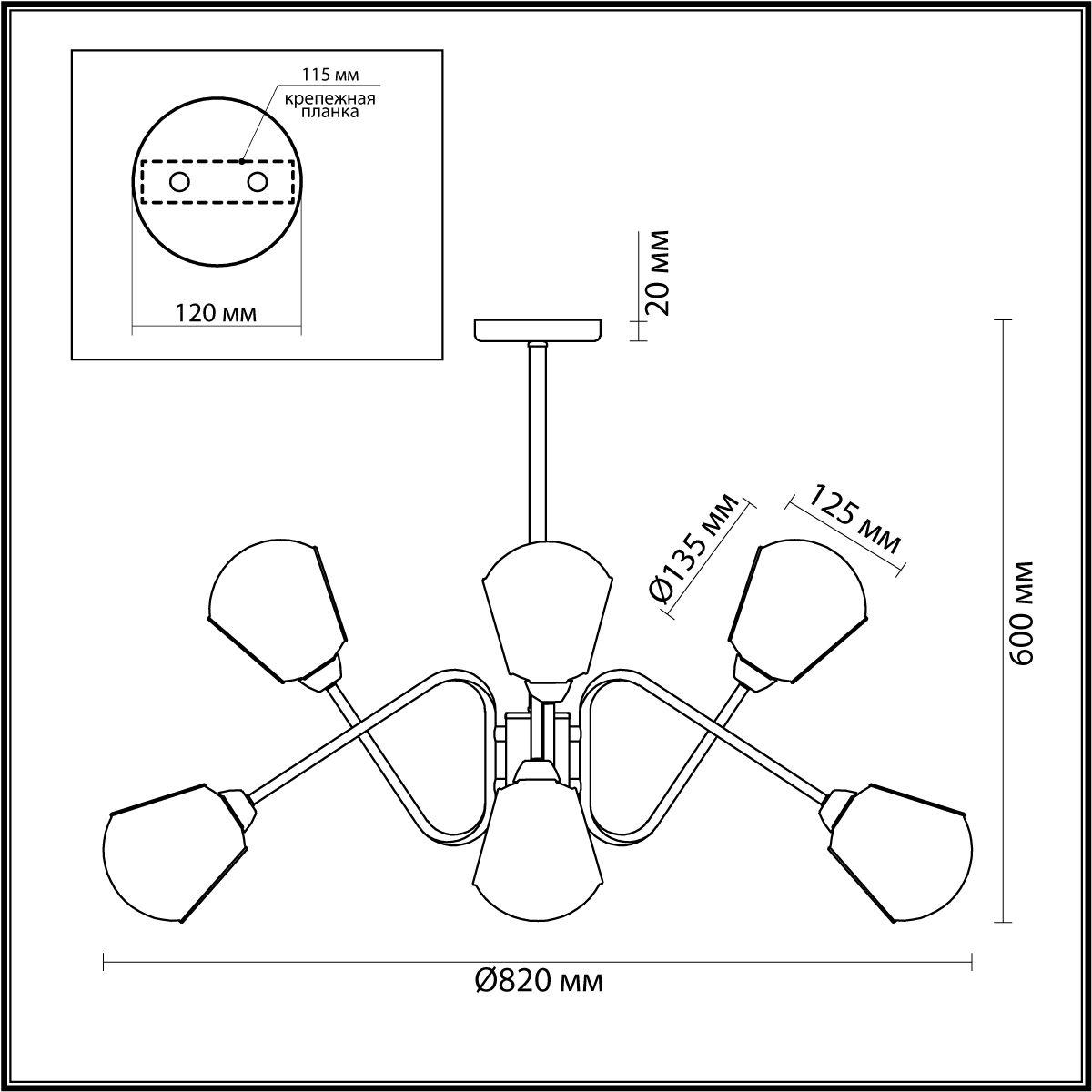 Производитель светильника рекомендует для устройства 8 ламп накаливания с цоколем E14 и мощностью 40 W, что позволит осветить помещение площадью кв.м. Габариты изделия: высота – 600 мм, диаметр – 820 мм.