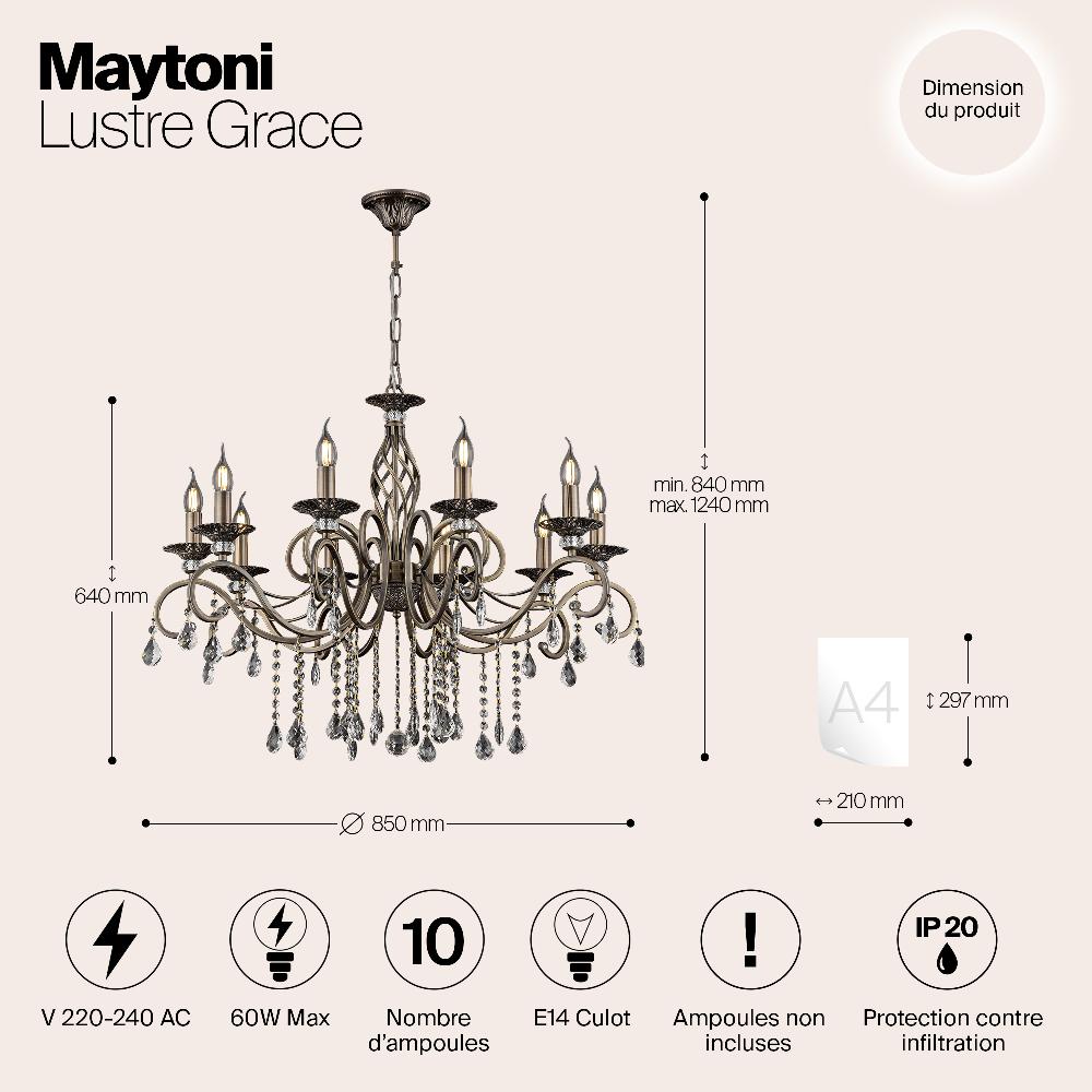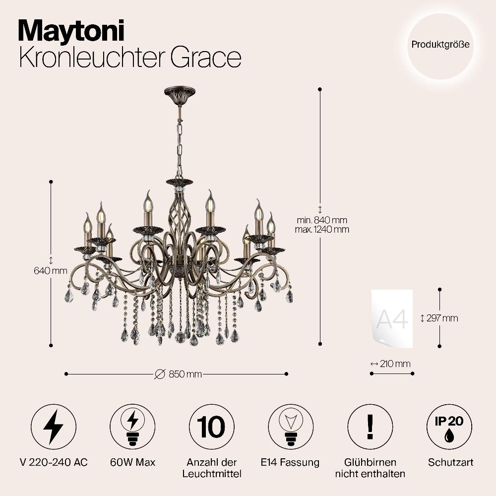 Подвесная люстра Maytoni Grace RC247-PL-10-R от бренда Maytoni из коллекции Royal Classic будет удачно смотреться в гостиной в . Светильник выполнен из стекла с плафонами в форме прозрачного цвета.