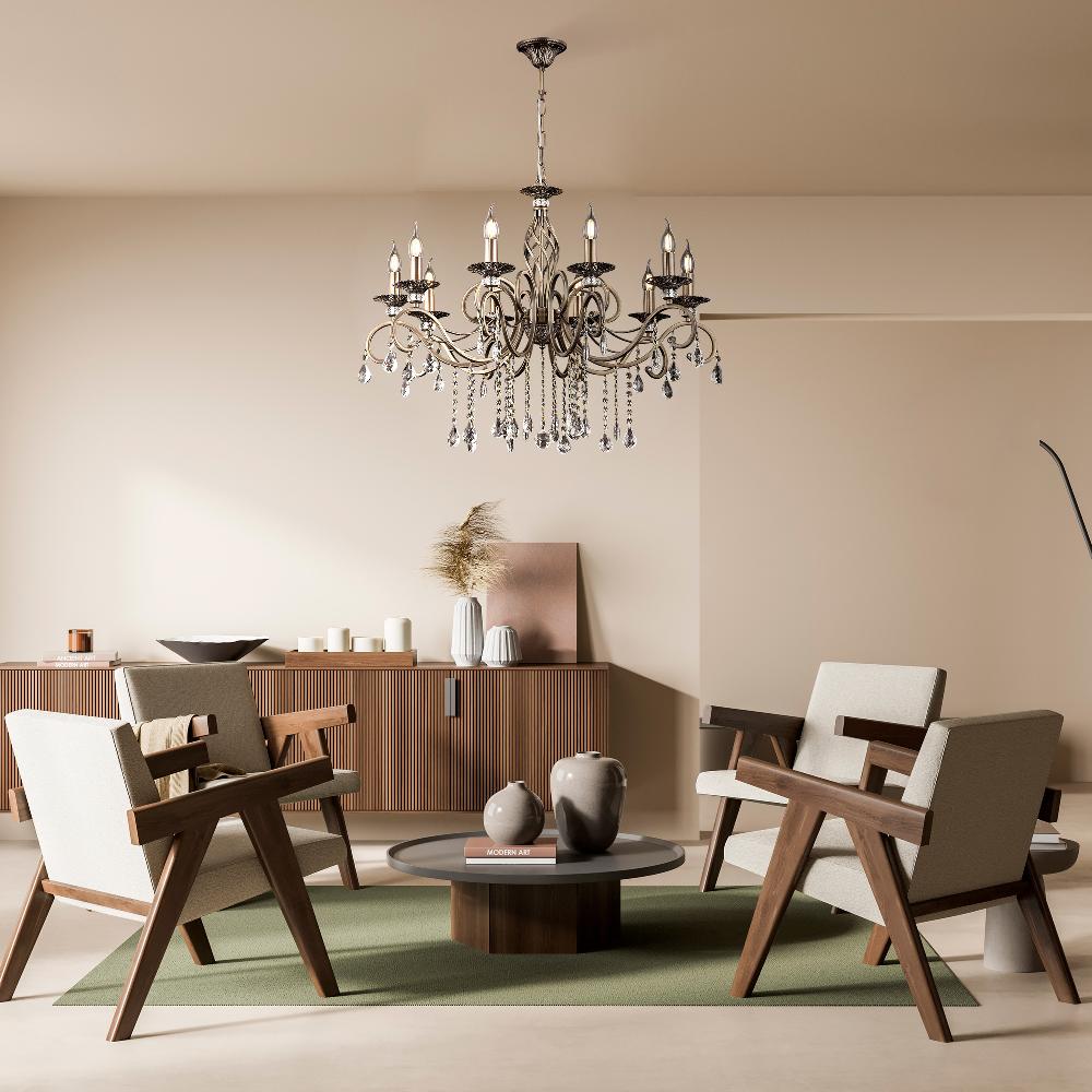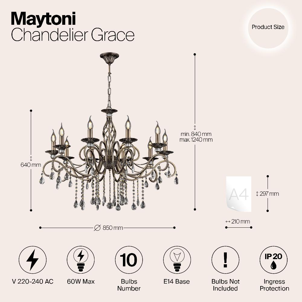 Производитель светильника рекомендует для устройства 10 ламп накаливания с цоколем E14 и мощностью 60 W, что позволит осветить помещение площадью кв.м. Габариты изделия: высота – 1240 мм, диаметр – 850 мм.