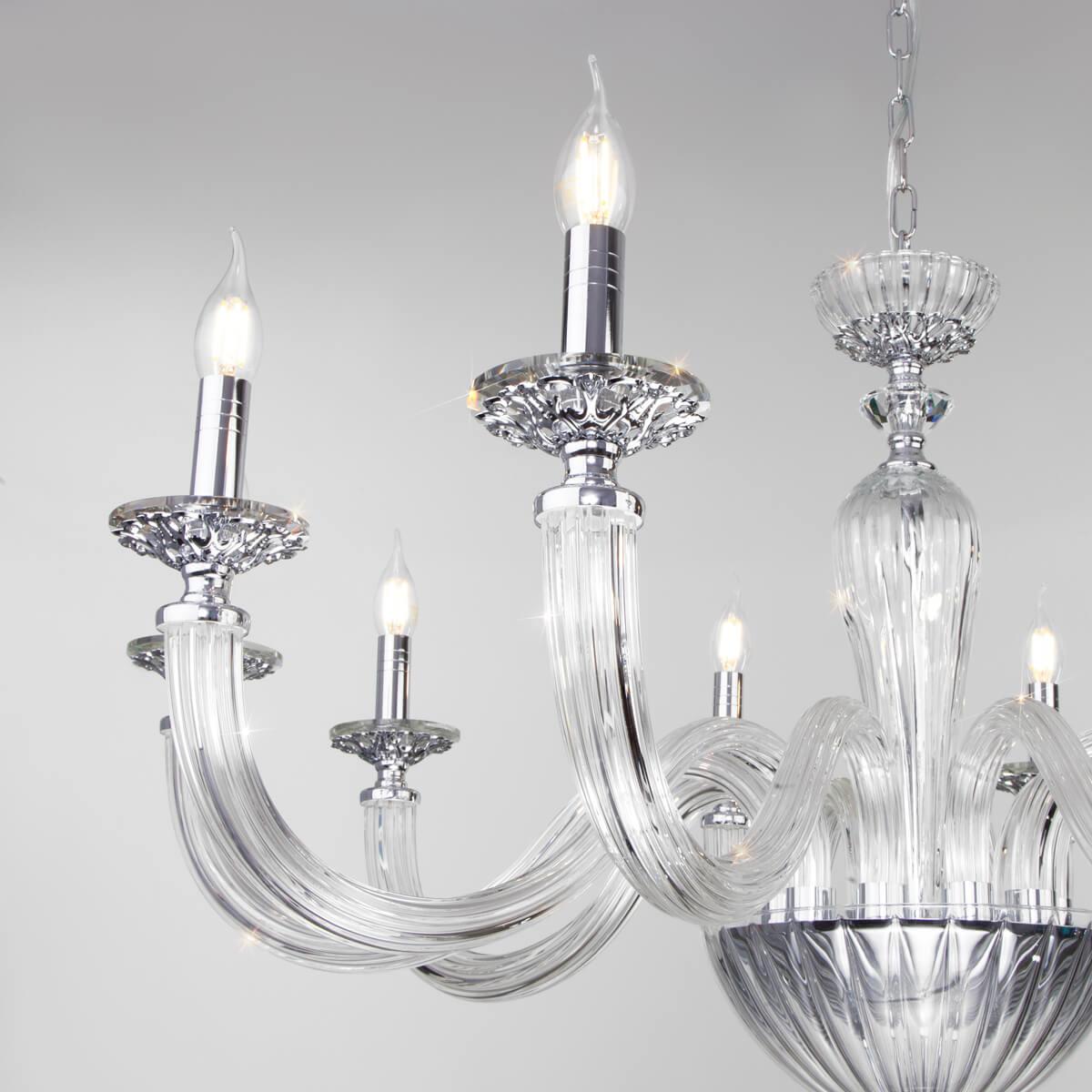 Производитель светильника рекомендует для устройства 10 ламп накаливания с цоколем E14 и мощностью 60 W, что позволит осветить помещение площадью 40 кв.м. Габариты изделия: высота – 600 мм, диаметр – 1000 мм.