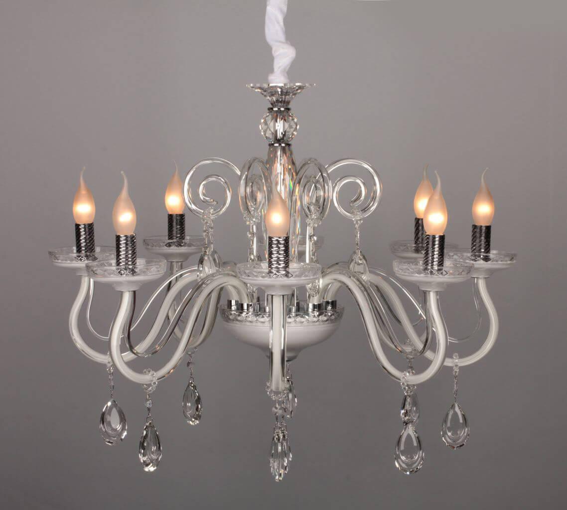 Производитель светильника рекомендует для устройства 8 ламп накаливания с цоколем E14 и мощностью 60 W, что позволит осветить помещение площадью 27 кв.м. Габариты изделия: высота – 2050 мм, диаметр – 750 мм.