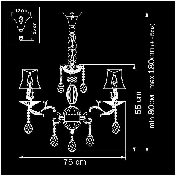 Производитель светильника рекомендует для устройства 8 ламп накаливания с цоколем E14 и мощностью 40 W, что позволит осветить помещение площадью 17,8 кв.м. Габариты изделия: высота – 1800 мм, диаметр – 750 мм.