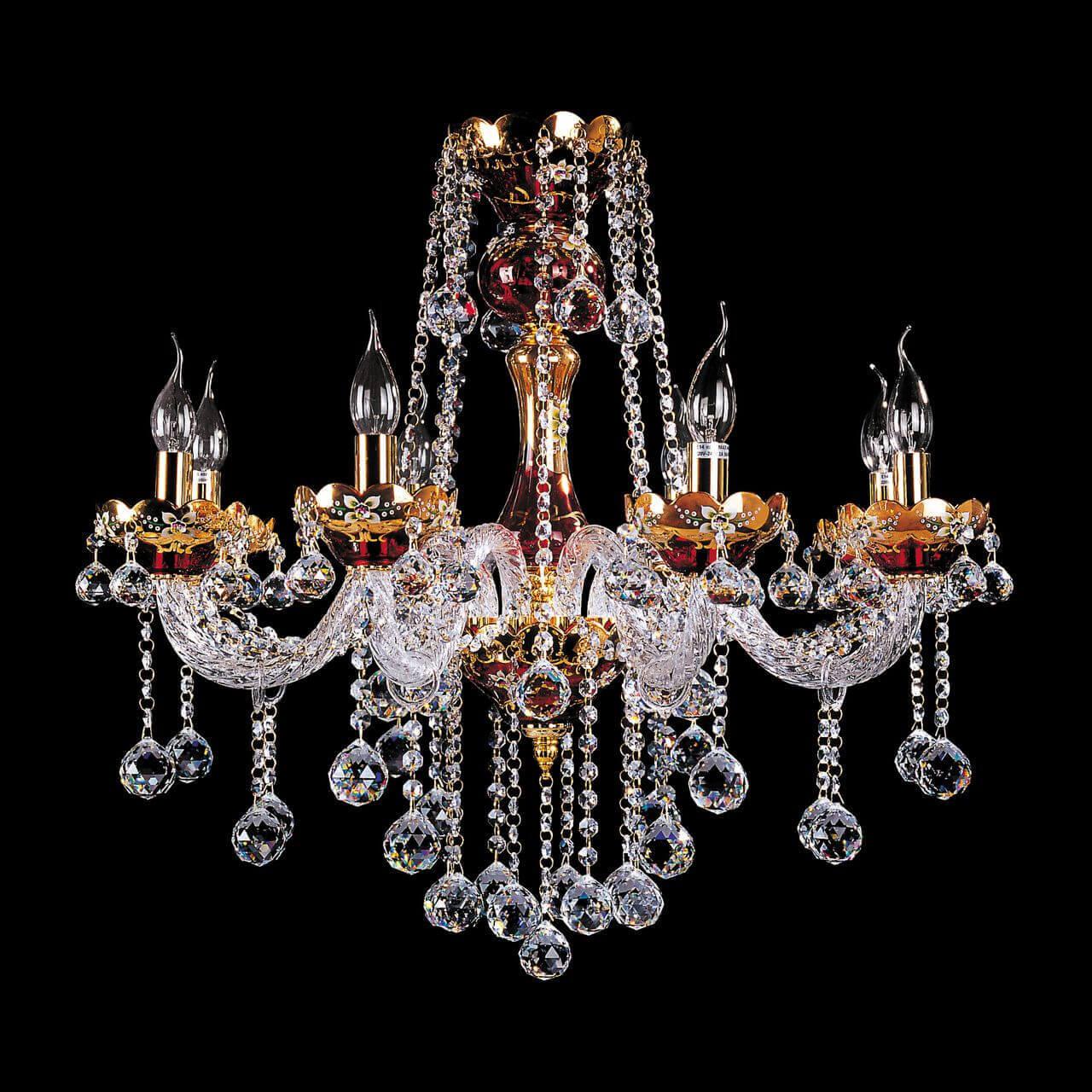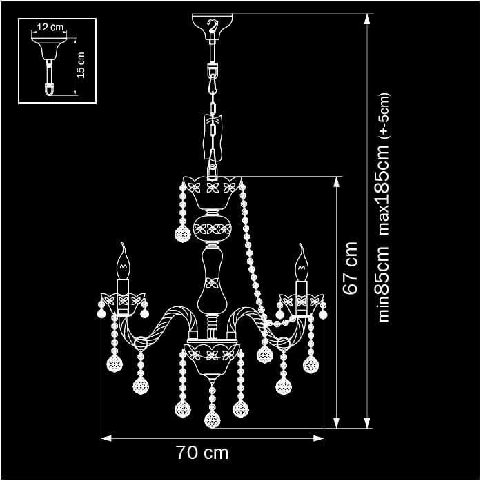 Производитель светильника рекомендует для устройства 8 ламп накаливания с цоколем E14 и мощностью 40 W, что позволит осветить помещение площадью 17,8 кв.м. Габариты изделия: высота – 1850 мм, диаметр – 720 мм.